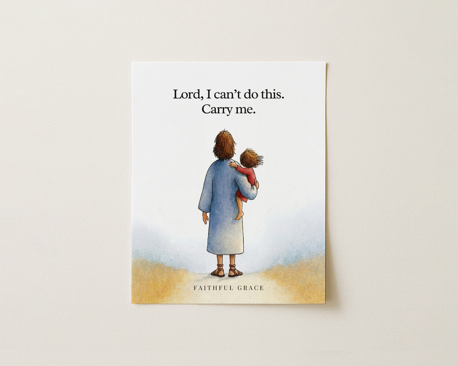 The illustration shows Jesus carrying a child, seen from behind as they move forward together. It is an image of being held when you cannot hold yourself, of continuing not by your own power but by being carried through what you cannot walk through alone.