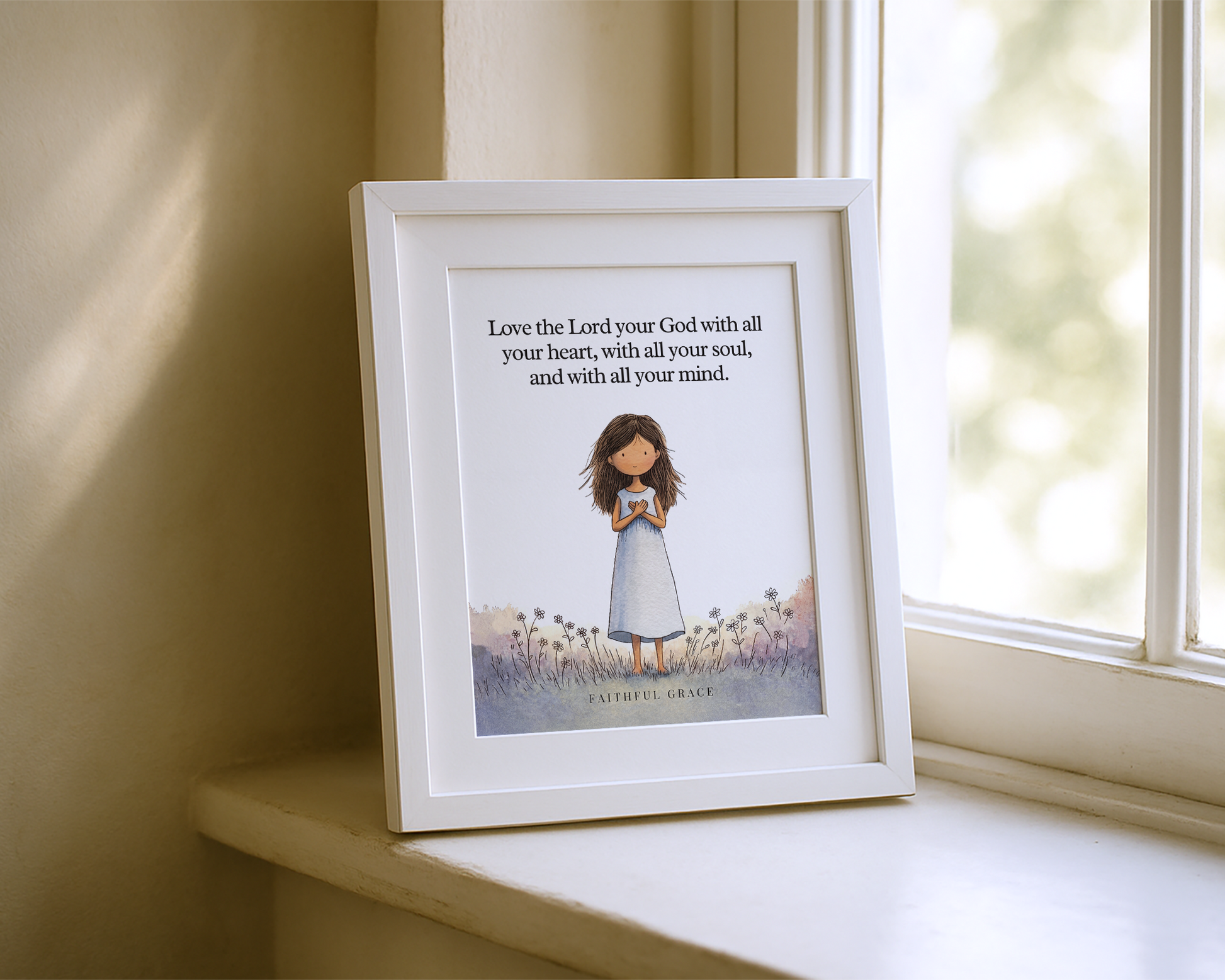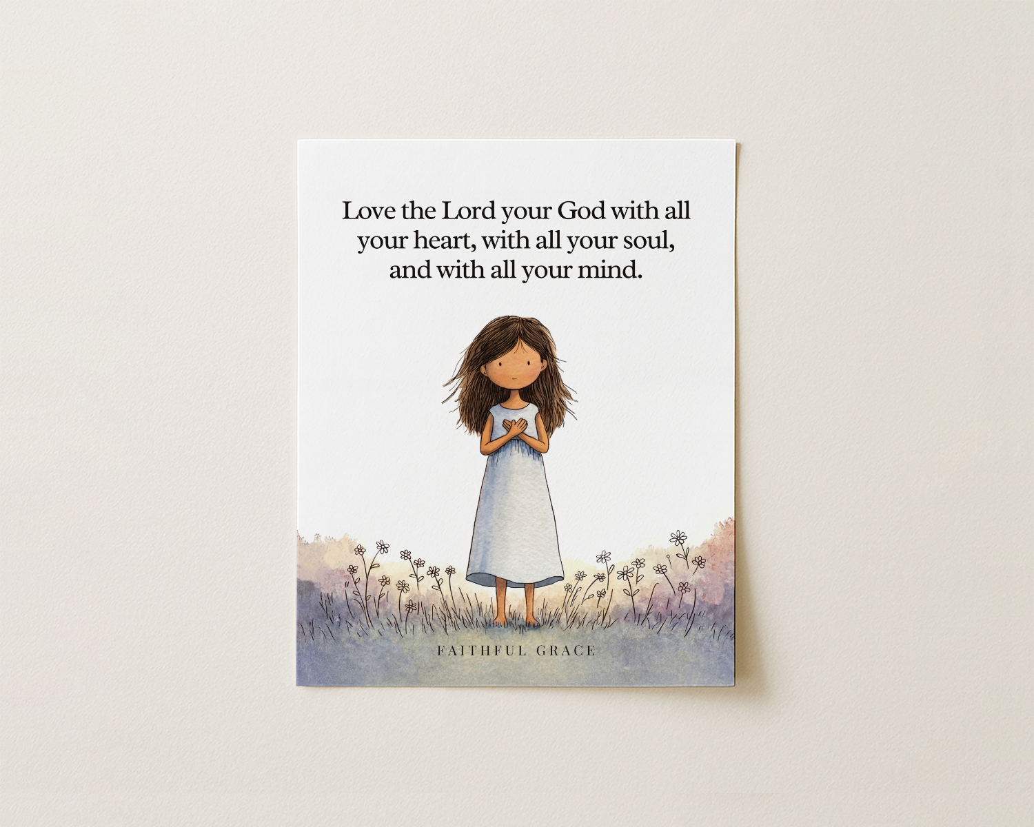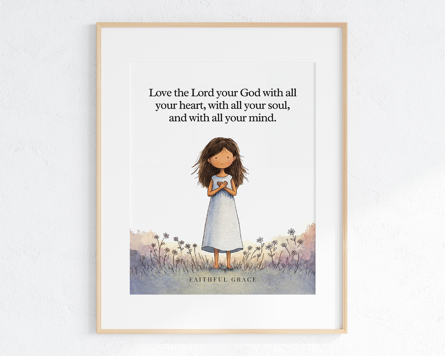This print belongs in spaces where devotion is cultivated. A bedroom where the day begins and ends. A prayer corner. Somewhere it can be seen as a daily reminder of what God asks for and what we were made to give, complete love from a whole heart.